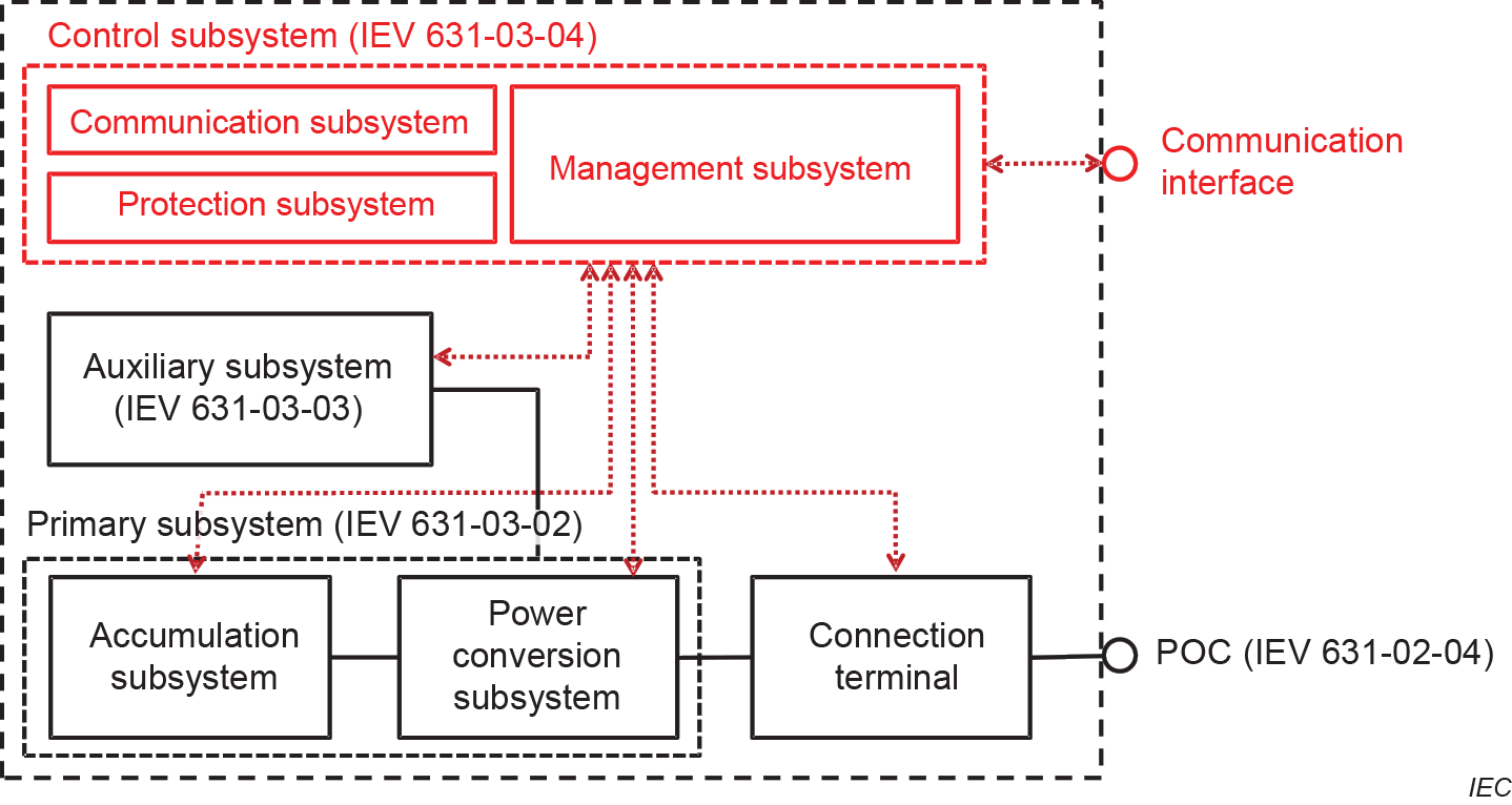 Note 1 to entry: Generally, the primary subsystem is connected to the primary POC through the primary connection terminal, and comprises at least the accumulation subsystem and the power conversion subsystem (see Figure 2 and Figure 3).