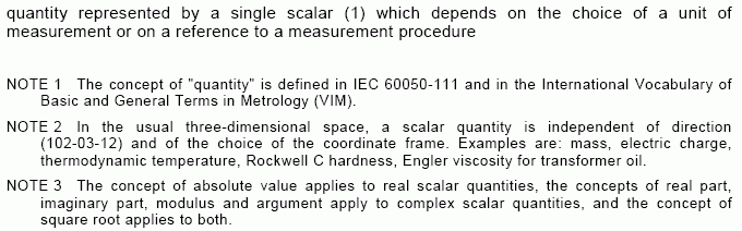 | Definition: | quantity represented by a single scalar (1) which depends on the choice of a unit of measurement or on a reference to a measurement procedure NOTE 1 The concept of "quantity" is defined in IEC 60050-111 and in the International Vocabulary of Basic and General Terms in Metrology (VIM). NOTE 2 In the usual three-dimensional space, a scalar quantity is independent of direction (102-03-12) and of the choice of the coordinate frame. Examples are: mass, electric charge, thermodynamic temperature, Rockwell C hardness, Engler viscosity for transformer oil. NOTE 3 The concept of absolute value applies to real scalar quantities, the concepts of real part, imaginary part, modulus and argument apply to complex scalar quantities, and the concept of square root applies to both.