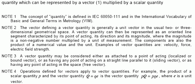 | quantity which can be represented by a vector (1) multiplied by a scalar quantity NOTE 1 The concept of "quantity" is defined in IEC 60050-111 and in the International Vocabulary of Basic and General Terms in Metrology (VIM). NOTE 2 The vector defining a vector quantity is generally a unit vector in the usual two- or three-dimensional geometrical space. A vector quantity can then be represented as an oriented line segment characterized by its point of acting, its direction and its magnitude, where the magnitude is a non-negative number multiplied by a unit of measurement. The components are also the product of a numerical value and the unit. Examples of vector quantities are: velocity, force, electric field strength. NOTE 3 A vector quantity may be considered either as attached to a point of acting (localized or bound vector), or as having any point of acting on a straight line parallel to it (sliding vector), or as having any point of acting in the space (free vector). NOTE 4 Operations defined for vectors apply to vector quantities. For example, the product of a scalar quantity p and the vector quantity is the vector quantity , where e is a unit vector.
