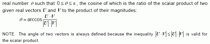 | real number ϑ such that 0 ≤ ϑ ≤ π, the cosine of which is the ratio of the scalar product of two given real vectors U and V to the product of their magnitudes: