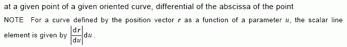 NOTE For a curve defined by the position vector r as a function of a parameter u, the scalar line element is given by | dr du |du MathType@MTEF@5@5@+= feaagKart1ev2aqatCvAUfeBSjuyZL2yd9gzLbvyNv2CaerbbjxAHX garuavP1wzZbItLDhis9wBH5garmWu51MyVXgarqqtubsr4rNCHbGe aGqipG0dh9qqWrVepG0dbbL8F4rqqrVepeea0xe9LqFf0xc9q8qqaq Fn0lXdHiVcFbIOFHK8Feea0dXdar=Jb9hs0dXdHuk9fr=xfr=xfrpe WZqaaeaaciWacmGadaGadeaabaGaaqaaaOqaamaaemaabaWaaSaaae aaciGGKbGaaCOCaaqaaiGacsgacaWG1baaaaGaay5bSlaawIa7aiGa csgacaWG1baaaa@3E2F@ .