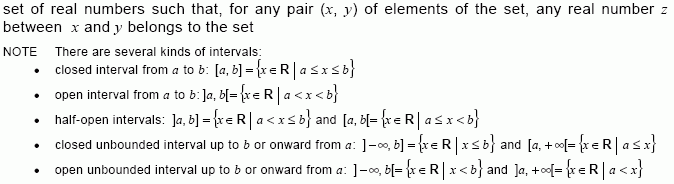 | Definition: | set of real numbers such that, for any pair (x, y) of elements of the set, any real number z between x and y belongs to the set NOTE There are several kinds of intervals: - closed interval from a to b: