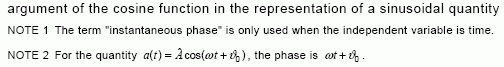 NOTE 2 For the quantity a(t)= A ^ cos(ω t+ ϑ 0 ) MathType@MTEF@5@5@+= feaagKart1ev2aqatCvAUfeBSjuyZL2yd9gzLbvyNv2CaerbbjxAHX garuavP1wzZbItLDhis9wBH5garmWu51MyVXgarqqtubsr4rNCHbGe aGqipG0dh9qqWrVepG0dbbL8F4rqqrVepeea0xe9LqFf0xc9q8qqaq Fn0lXdHiVcFbIOFHK8Feea0dXdar=Jb9hs0dXdHuk9fr=xfr=xfrpe WZqaaiqaciWacmGadaGadeaabaGaaqaaaOqaaiaadggacaGGOaGaam iDaiaacMcacqGH9aqpceWGbbGbaKaajugabiGacogacaGGVbGaai4C aOGaciikaiabeM8a3jaayIW7caWG0bGaey4kaSIaeqy0dO0aaSbaaS qaaKqzadGaaGimaaWcbeaakiaacMcaaaa@4817@ , the phase is ω t+ ϑ 0 MathType@MTEF@5@5@+= feaagKart1ev2aqatCvAUfeBSjuyZL2yd9gzLbvyNv2CaerbbjxAHX garuavP1wzZbItLDhis9wBH5garmWu51MyVXgarqqtubsr4rNCHbGe aGqipG0dh9qqWrVepG0dbbL8F4rqqrVepeea0xe9LqFf0xc9q8qqaq Fn0lXdHiVcFbIOFHK8Feea0dXdar=Jb9hs0dXdHuk9fr=xfr=xfrpe WZqaaiqaciWacmGadaGadeaabaGaaqaaaOqaaiabeM8a3jaayIW7ca WG0bGaey4kaSIaeqy0dO0aaSbaaSqaaKqzadGaaGimaaWcbeaaaaa@3E52@ .