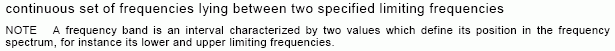 | Definition: | continuous set of frequencies lying between two specified limiting frequencies NOTE A frequency band is an interval characterized by two values which define its position in the frequency spectrum, for instance its lower and upper limiting frequencies.