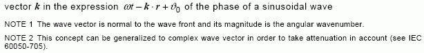 | vector k in the expression of the phase of a sinusoidal wave NOTE 1 The wave vector is normal to the wave front and its magnitude is the angular wavenumber. NOTE 2 This concept can be generalized to complex wave vector in order to take attenuation in account (see IEC 60050-705).