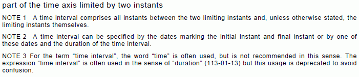 | part of the time axis limited by two instants NOTE 1 A time interval comprises all instants between the two limiting instants and, unless otherwise stated, the limiting instants themselves. NOTE 2 A time interval can be specified by the dates marking the initial instant and final instant or by one of these dates and the duration of the time interval. NOTE 3 For the term “time interval”, the word “time” is often used, but is not recommended in this sense. The expression “time interval” is often used in the sense of “duration” (113-01-13) but this usage is deprecated to avoid confusion.