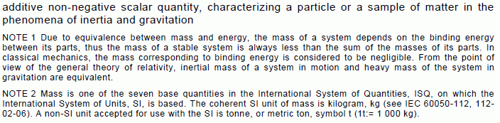 | Definition: | additive non-negative scalar quantity, characterizing a particle or a sample of matter in the phenomena of inertia and gravitation NOTE 1 Due to equivalence between mass and energy, the mass of a system depends on the binding energy between its parts, thus the mass of a stable system is always less than the sum of the masses of its parts. In classical mechanics, the mass corresponding to binding energy is considered to be negligible. From the point of view of the general theory of relativity, inertial mass of a system in motion and heavy mass of the system in gravitation are equivalent. NOTE 2 Mass is one of the seven base quantities in the International System of Quantities, ISQ, on which the International System of Units, SI, is based. The coherent SI unit of mass is kilogram, kg (see IEC 60050-112, 112-02-06). A non-SI unit accepted for use with the SI is tonne, or metric ton, symbol t (1 t ≔ 1 000 kg).