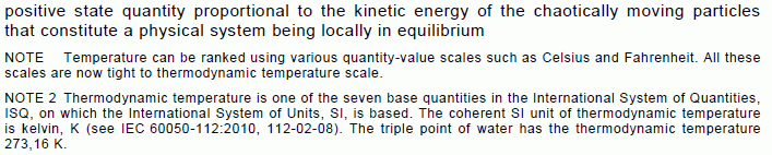 | Definition: | positive state quantity proportional to the kinetic energy of the chaotically moving particles that constitute a physical system being locally in equilibrium NOTE Temperature can be ranked using various quantity-value scales such as Celsius and Fahrenheit. All these scales are now tight to thermodynamic temperature scale. NOTE 2 Thermodynamic temperature is one of the seven base quantities in the International System of Quantities, ISQ, on which the International System of Units, SI, is based. The coherent SI unit of thermodynamic temperature is kelvin, K (see IEC 60050-112:2010, 112-02-08). The triple point of water has the thermodynamic temperature 273,16 K.