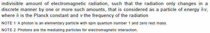 | Definition: | indivisible amount of electromagnetic radiation, such that the radiation only changes in a discrete manner by one or more such amounts, that is considered as a particle of energy hν, where h is the Planck constant and ν the frequency of the radiation NOTE 1 A photon is an elementary particle with spin quantum number 1 and zero rest mass. NOTE 2 Photons are the mediating particles for electromagnetic interaction.