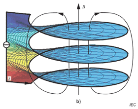 Dans la Figure 1a), les lignes de champ magnétique (B) relient les enroulements de la bobine.