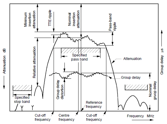 Figure 11 – Réponse en fréquence de l’affaiblissement d’insertion d’un filtre Note 1 à l'article: Cet article était numéroté 561-03-10 dans l'IEC 60050-561:1991. |