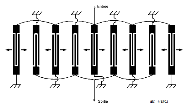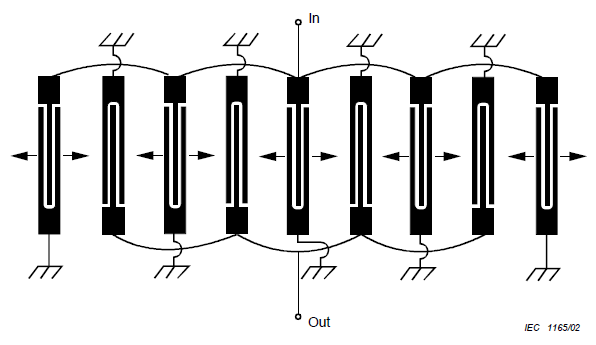Figure 10 – Interdigitated interdigital transducer (IIDT) Note 1 to entry: IIDTs (or multi-interdigital transducer) resonator filters are referred to as SAW resonator filters composed of a number of IDTs for input and output in a line alternating with grating reflectors confirming the interdigital transducer structure at both ends. |